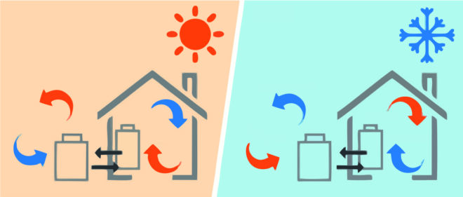 Bei der Split-Version ist die Außeneinheit (in der sich ein Kompressor befindet) mit der Inneneinheit (in der sich ein Wärmetauscher und eine Pumpe befinden) über Rohre verbunden, die das Arbeitsmedium enthalten (Kältemitte – ohne Gefriergefahr). Um eine maximale Effizienz zu erreichen, werden Wärmepumpen an Niedertemperatur-Heiz-/Kühlsysteme (Fußbodenheizung und Gebläse-Konvektoren) angeschlossen. Neben der hohen Effizienz können Wärmepumpen zusätzlich zum heizen auch kühlen, was einen großen Vorteil gegenüber herkömmlichen Heizsystemen darstellt. Für ein solches Heiz-/Kühlsystem im Haus ist es notwendig, nur 1 m² Platz in einem technischen Raum bereitzustellen – es ist kein Heizraum erforderlich, während 0,5 m² an der Außenseite des Hauses ausreichen.