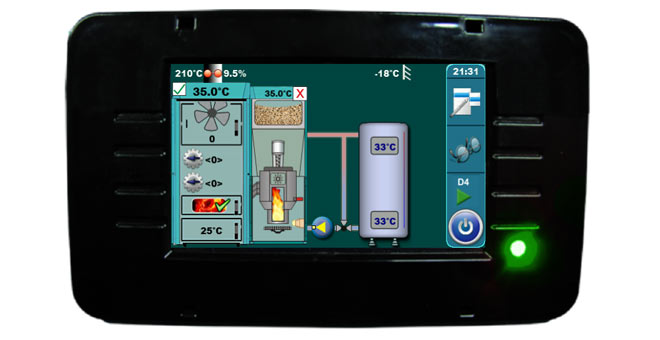 Multifunctional digital boiler control using lambda probe and underpressure fan optimizes combustion in both combustion chambers, which increases the efficiency of the boiler. The pellet tank is an integral part of the boiler to which the automatic vacuum pellet supply can be installed. The installation of the accumulation tank (CAS) is obligatory. It is possible to expand the boiler control with the CM2K-B module (steering of 2 heating circuits to the outside temperature, max.4xCM2K), alarm message and boiler start/stop module CMGSM.