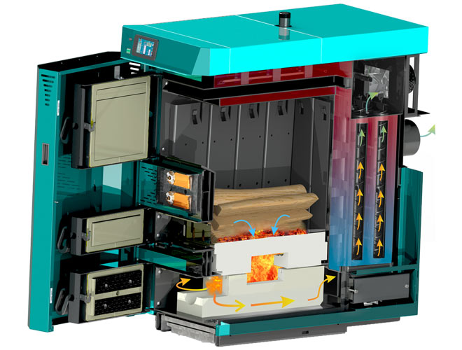 • Die eingebaute Kesselsteuerung (Farb-Touchscreen) steuert den Kesselbetrieb mit dem Kesselsensor, der Lambdasonde, dem Temperatursensor im Brennkammer, den Primär- und Sekundärluftansaug-Steuermotoren sowie die Änderung der Drehgeschwindigkeit des Ventilators am Austritt von Rauchgas aus dem Kessel.
